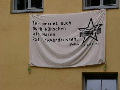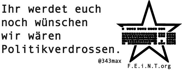 Hier noch die Transpi-Vorlage (pdf). Wie immer soll das Material befreit und kollektiviert werden. Hier gibt es noch den InDesign-Export (zip), dass ihr z.B. den FEiNT.org Schriftzug entfernen könnt oder es remixen könnt, was wir ausdrücklich wünschen! Wenn ihr es in eure Materialsammlungen aufnehmt, wäre aber ein Trackback/Verlinkung/Verweis auf den Artikel hier ganz nett ;)