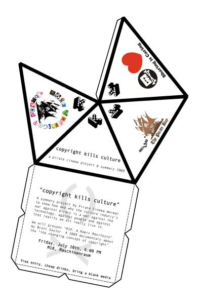 Eines unserer beiden Projekte zur diesjährigen summaery heißt COPYRIGHT KILLS CULTURE und wird ein mehr oder weniger klassisches PIRATE CINEMA, aber durch eine thematische Einführung in die Kritik am Urheberrecht und in den Copyfight unterlegt.