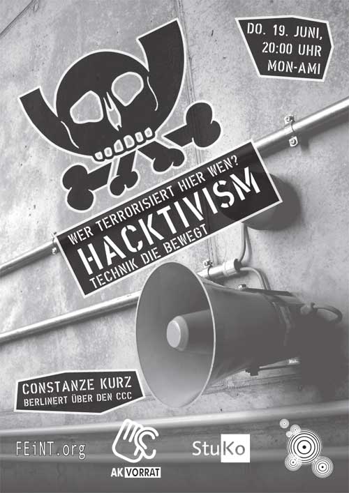 definiert. Oder um's einfacher zu schreiben: "Hacktivism ist Technik die bewegt". Letzteres ist zumindest der mittlerweile offizielle Titel von Constanze Kurz' Vortrag morgen Abend im mon-ami, Weimar. Der Zweittitel: "Constanze Kurz berlinert über den CCC" kommt dem eigentlichen Inhalt wohl näher, schien uns aber für den offiziellen Titel ein wenig gewagt – besonders nachdem er nicht schon beim ersten Bier im Falken entwickelt wurde.